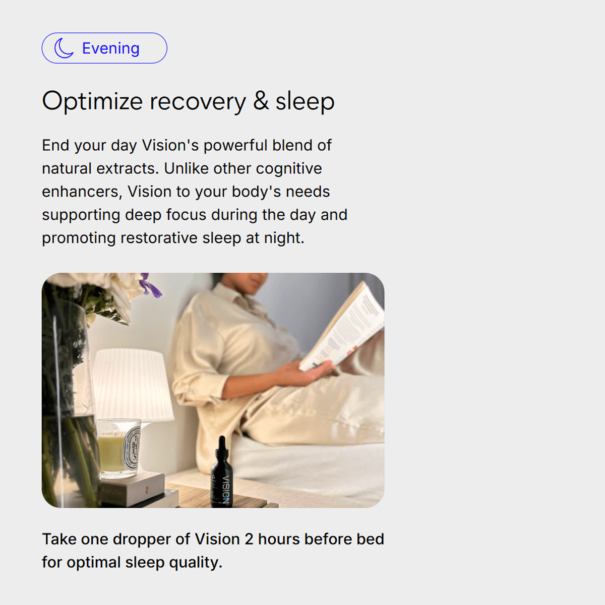 Vision Mojo is designed to boost mental clarity, focus, energy, and recovery. It supports peak performance during the day and restful sleep at night..