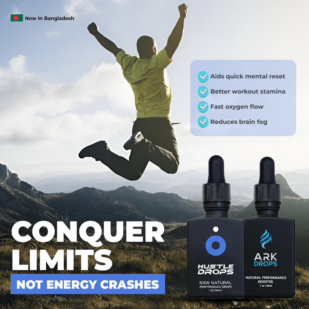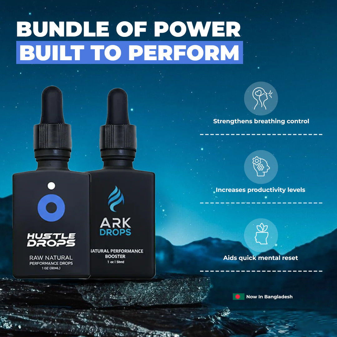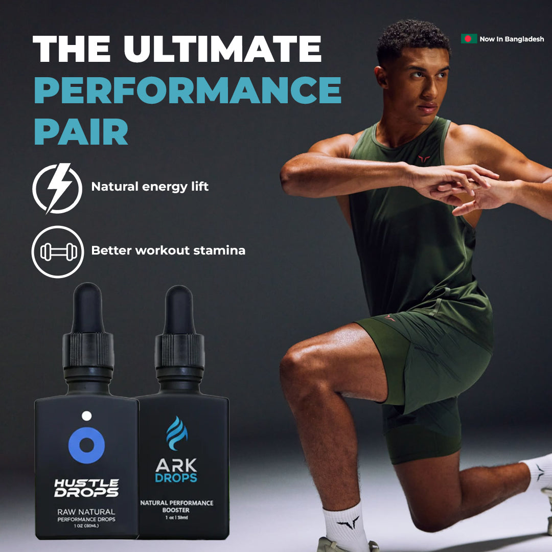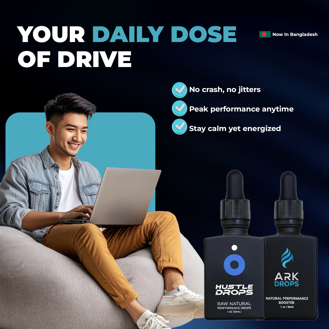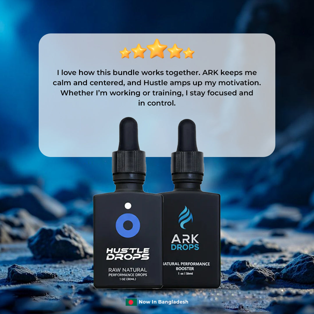 “The combo works perfectly — Ark Drops keep me energized and focused through the day, while Hustle Drops give me that extra edge when I need to push harder. Perfect balance of clarity and drive.” — Rehman.